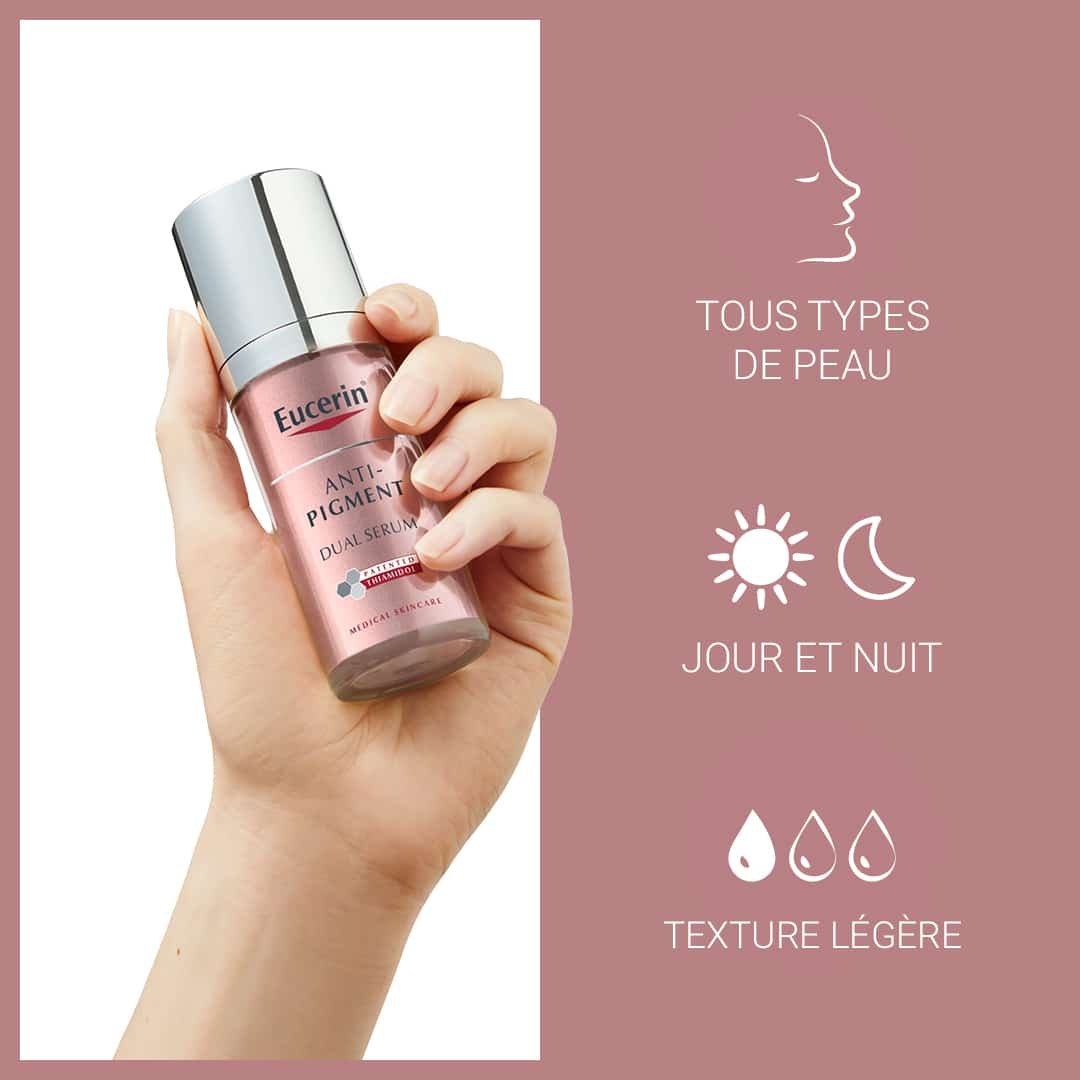 Suite à de nombreux tests en laboratoire, il a été cliniquement prouvé que la gamme innovante Anti-Pigment d’Eucerin réduit les taches brunes telles que les taches de vieillesse causées par l’exposition au soleil et les empêche de réapparaître. L’ingrédient très efficace Thiamidol réduit la production de mélanine dans la peau, agissant à l’origine de l’hyperpigmentation. Fabriquée à partir de cet ingrédient breveté par Eucerin, la gamme comprend plusieurs produits pour traiter l’hyperpigmentation.